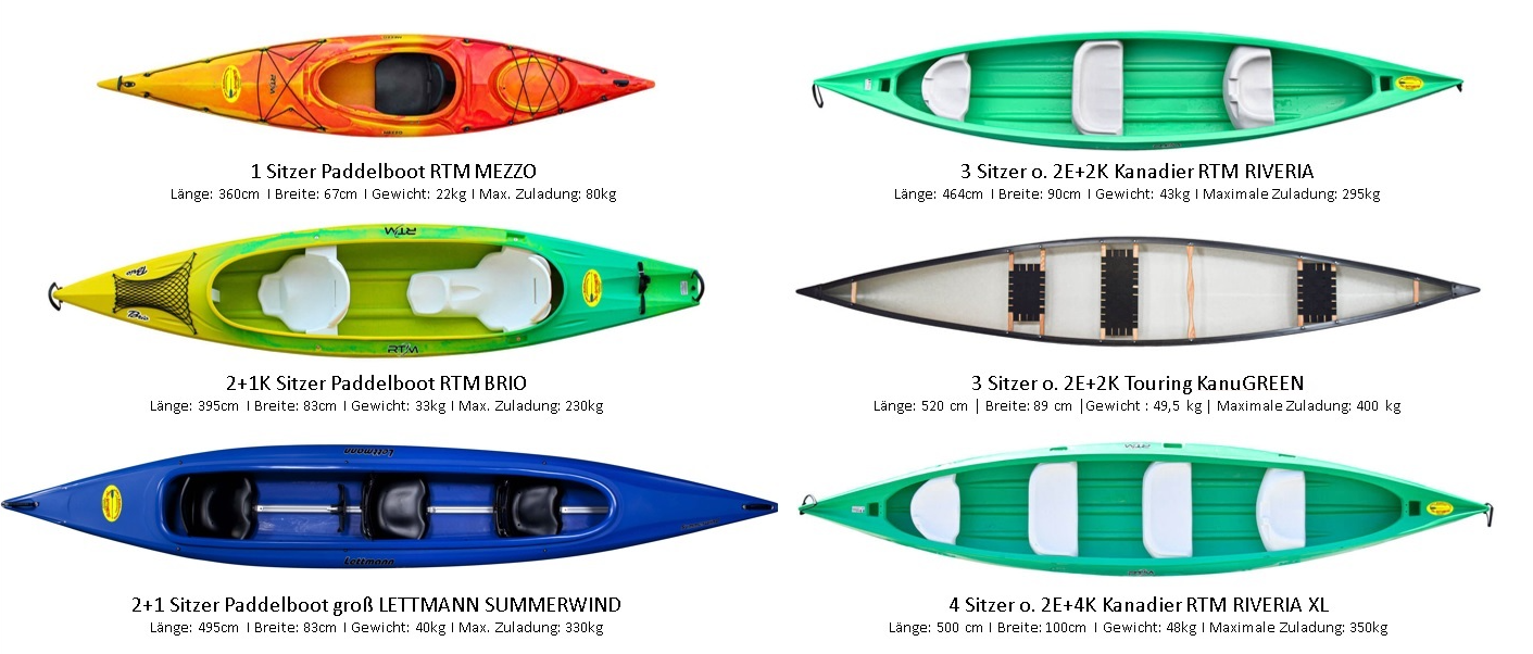 Es sind 1er, 2er und 3er Kajak/Paddelboote sowie 3er und 4er Canadier vorhanden.